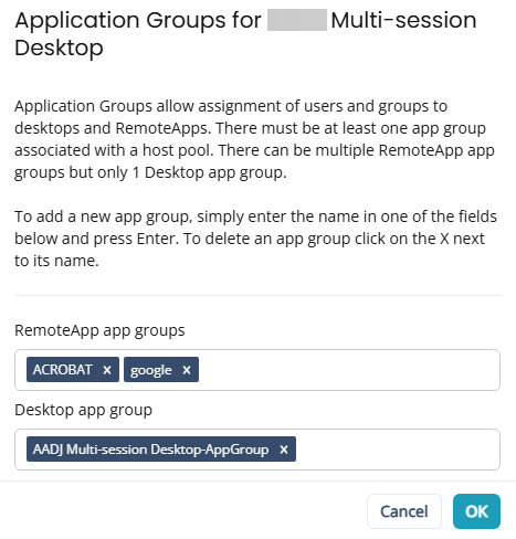 If the host pool has multiple RemoteApp app groups, a specific RemoteApp app group must be selected. By publishing different applications to different Application Groups, administrators can control access to these applications via group membership. This allows user groups to be served different applications from the same host pool.
