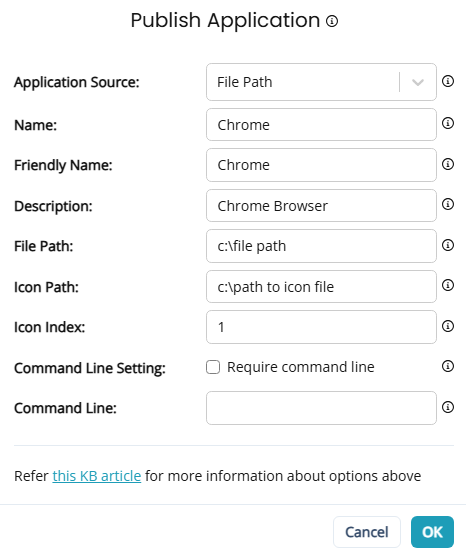 - Icon Path: Optionally, type the path to an icon file to be used for this RemoteApp when it appears in the user's Remote Desktop feed.